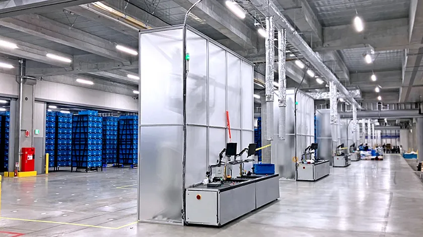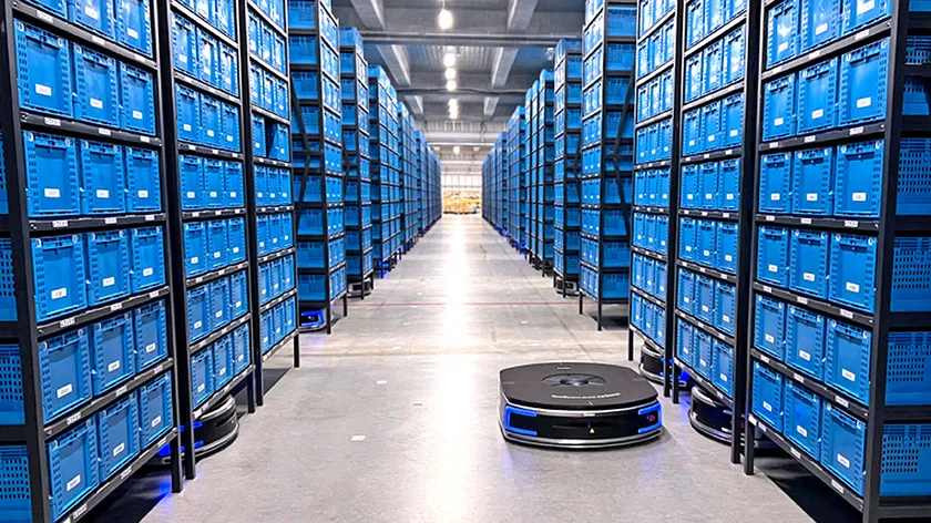 倉庫の高さを有効活用し、防火シャッター直下を通過できる高さ(3.8メートル)で稼働が可能。防火区画をまたいでロボットが行き来することで、防火区画ごとでオペレーションを区切らず、広い空間を一体的に運用できるのが特徴。ラックの保管効率向上に加え、AGVのメリットのコストパフォーマンスと台数設定の柔軟性を活かした設計を採用している。