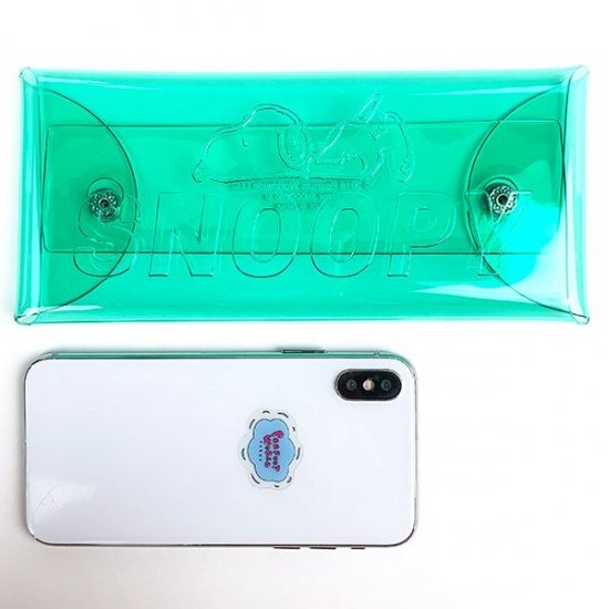 鮮やかなグリーンが春らしさも感じる、寝そべりデザインのケースです。寝そべりポージのスヌーピーや大きなロゴが型押しされていて、オススメの一品♪