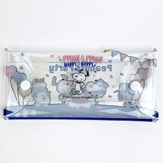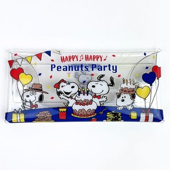 パーティーを楽しむスヌーピーやブラザーズのデザインが楽し気な、クリアマルチケースです。お誕生日でしょうか、バルーンやガーランドなどもカラフルで、クリアなケースによく映えています。