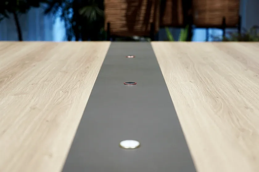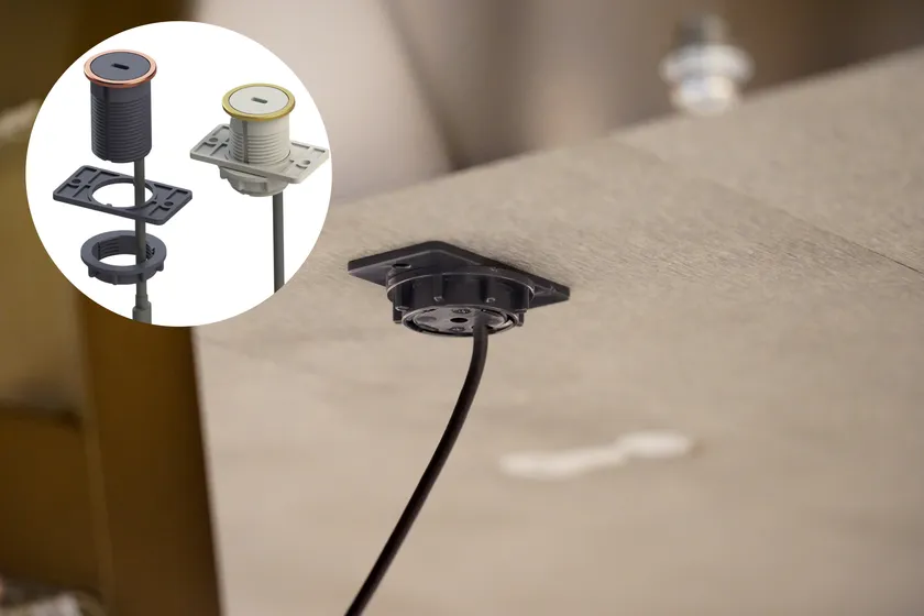 調整ナットにより10mm~32mmの天板厚に対応。直径30mmの取付穴を空けていただければ、結線等は不要で簡単取付が可能です。またシンプルな構造により天板裏の見た目もスッキリまとまります。