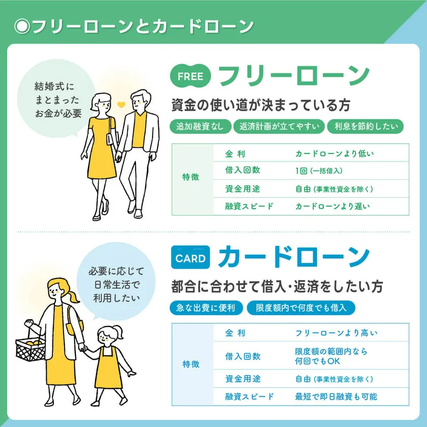 資金の利用目的がはっきり決まっていて、着実に返済したい方はフリーローンが向いています。対して、利便性を求める方はカードローンの方が向いています。必要なときに都度利用できるので、生活費の補填に少しだけ借りたいときにも便利です。