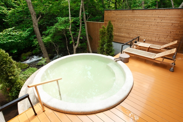 土地の地形や木々を活かした大風呂、4つの貸切露天風呂は、季節・時間によってその表情を変えます。露天風呂の湯巡りで、自然のなかに溶け込むようなひとときをお楽しみください。