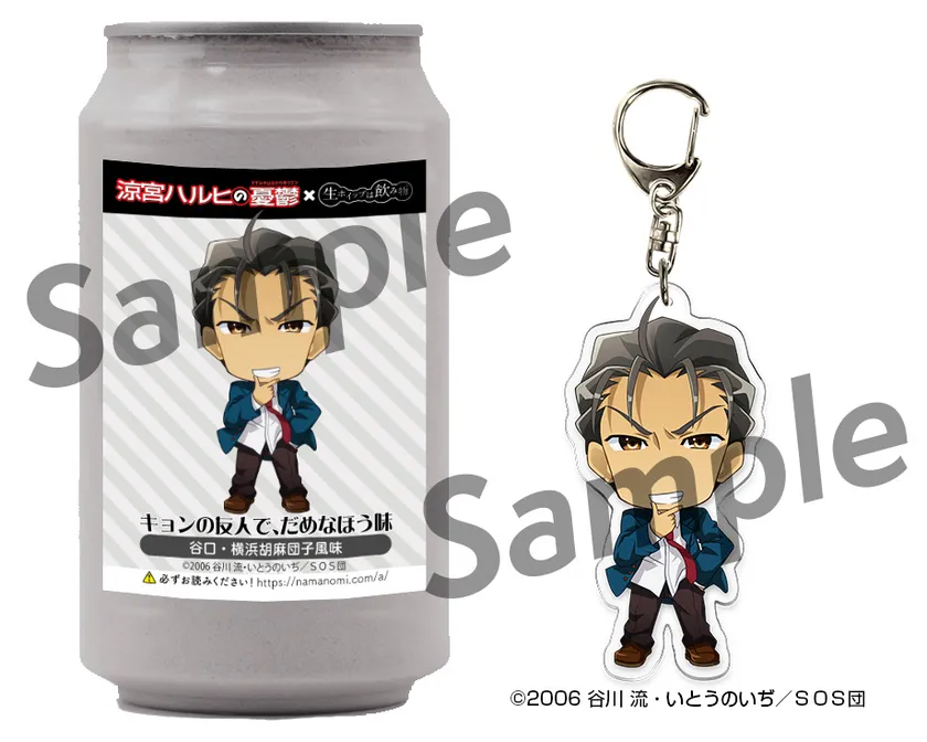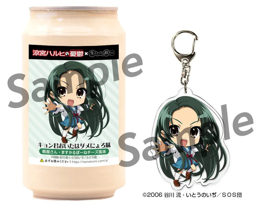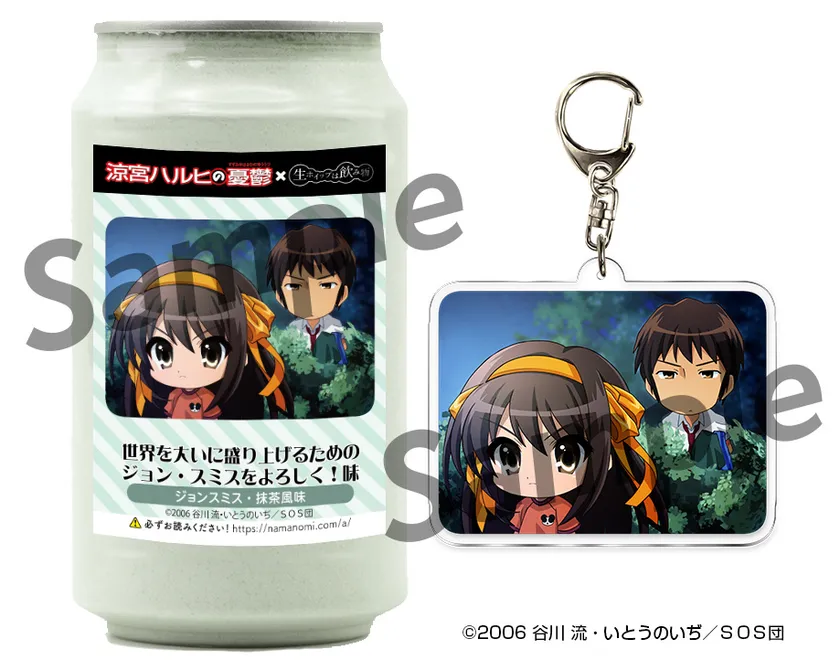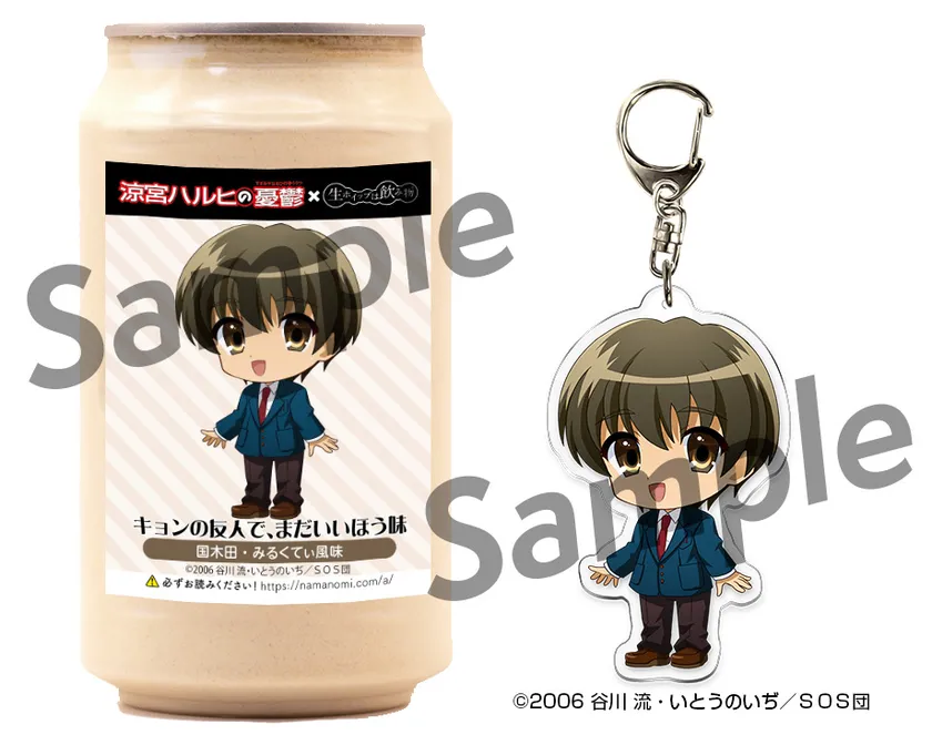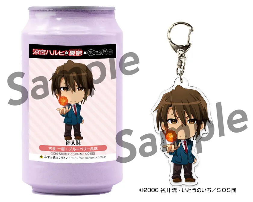 TVアニメ「涼宮ハルヒの憂鬱」に登場する「涼宮ハルヒ」・「キョン」・「長門有希」・「朝比奈みくる」・「古泉一樹」・「朝倉涼子」・「鶴屋さん」・「谷口」・「国木田」・「ジョンスミス」の各キャラクターをイメージしたパッケージと味の「生ホイップは飲み物(R)」と、アクリルキーホルダーのセット商品です。各商品につきシールが1枚ついています。