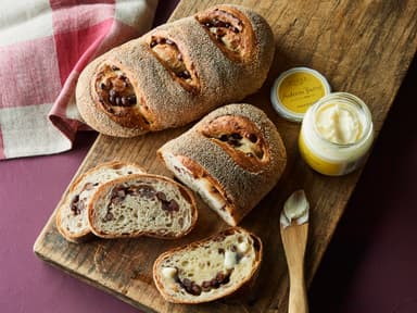 生地に北海道産のあずきとバターを混ぜ込み、さらにあずきを巻き込んで 焼き上げました。「ファーマーズブレッドシリーズ」の1月限定商品です。バターと合わせることで、あずきのやさしい甘みが引き出され、どこか懐かしい味わいに仕上げました。