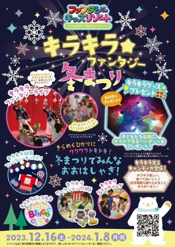 日本最大級の室内遊園地「ファンタジーキッズリゾート」(運営:ファンタジーリゾート株式会社、代表取締役社長:八杉 政彦)は、冬休み期間の限定イベントとして、子どもが夢中になれる「キラキラ★ファンタジー冬まつり」を、2023年12月16日(土)から2024年1月8日(月・祝)、全国のファンタジーキッズリゾートにて開催します。