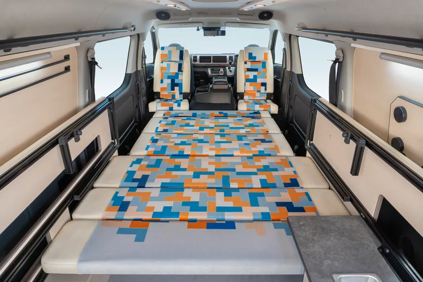 キャンピングカー「アコロ」は、実際に株式会社キャンピングカーランド販売するモデルで、若い女性、インテリアアートなどに敏感なお客様に対して訴求できるデザインになっています。飛行機や鉄道のシート生地で有名な、住江織物が制作したワンオフの生地と明るめの内装を組み合わせました。