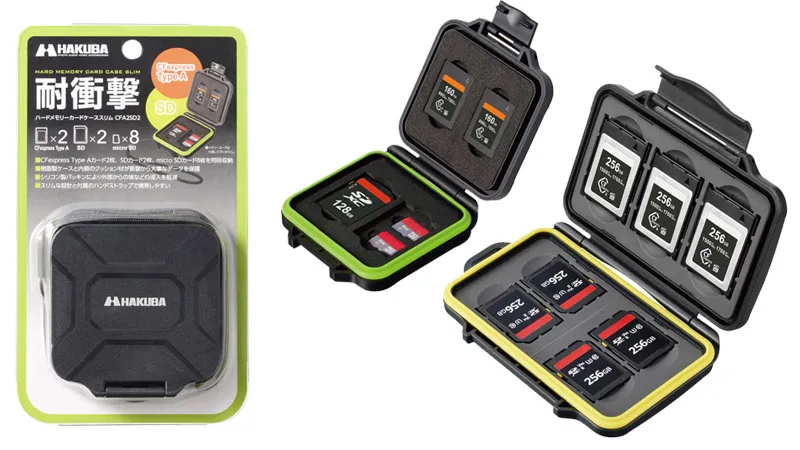CFB3SD4(イエロー)は、CFexpress Type BカードまたはXQDカード3枚とSDカード4枚を同時に収納、スリムなCFA2SD2(グリーン)は、CFexpress Type Aカード2枚とSDカード2枚、microSDカード8枚を同時に収納することができます。※メモリーカードは付属しておりません。