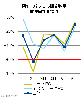 ・2013年上半期(1-6月)のB2B市場におけるパソコンの販売数量は前年比13%増。