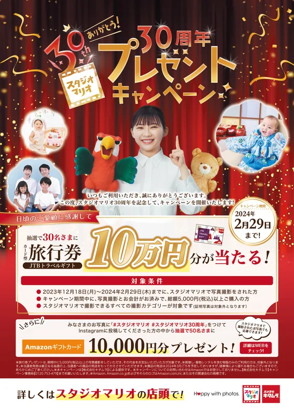 株式会社キタムラ(本社:東京都新宿区、代表取締役社長:浜田 宏幸)が全国に展開するこども写真館「スタジオマリオ」は、1994年4月に1号店をOPENしてから2024年3月で30周年を迎えます。これまでの感謝をこめて2023年12月18日(月)~2024年2月29日(木)の期間限定で、旅行券10万円分が抽選で30名さまに当たるスタジオマリオ30周年プレゼントキャンペーンを実施いたします。