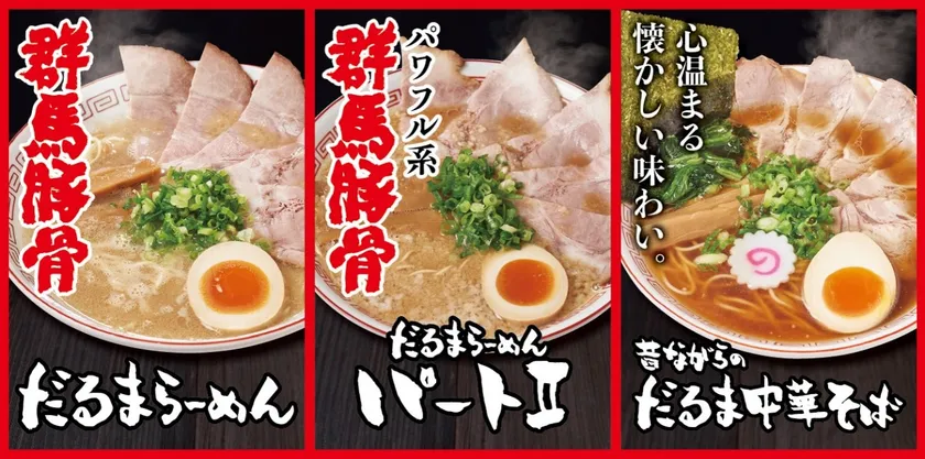 群馬県を代表する豚骨らーめんの名店「だるま大使 本店」の世界観を受け継ぎ、よりたくさんのお客様に楽しんでいただけるようブラッシュアップされたラーメンブランド。看板メニューの「だるまらーめん」「だるまらーめんパートII」「もつ煮」のクオリティは、本店に匹敵する味に仕上げたと原仁社長(株式会社 CREST)は語ります。小さなお子様も家族と一緒に過ごせるテーブル席や、味の幅を広げるために優しい味わいの「昔ながらのだるま中華そば」も新たに開発され、オープン初日でのデビューが決定しています。