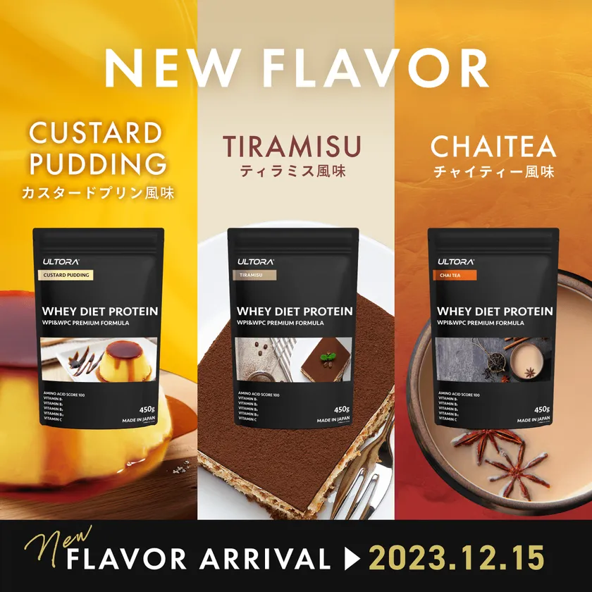 株式会社ULTORA(所在地:東京都渋谷区、代表取締役:高田 卓慎)は、「WHEY DIET PROTEIN」シリーズより、新フレーバーとなる「カスタードプリン風味」「ティラミス風味」「チャイティー風味」の3種を、2023年12月15日(金)に販売開始いたしました。