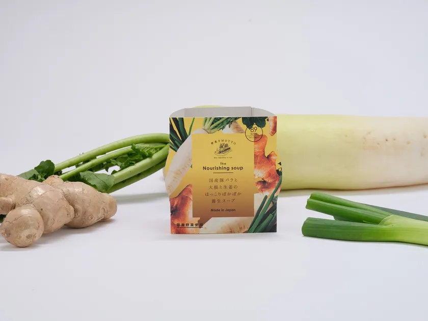 モンマルシェ株式会社が運営する国産野菜フードブランド【野菜をMOTTO】は、12月22日(金)公式オンラインショップにて新商品「国産豚バラと大根と生姜のほっこりぽかぽか養生スープ」を発売いたします。定番和食豚バラ大根をスープとして再構築。利尻昆布と本節をつかった出汁には醤油や味噌ではなく岡山県の天然の海水を精製した塩でシンプルに味をつけ、大根は味しみがよくなるよう丁寧に下ゆでをおこなっています。古くから胃腸によいとされる大根と体をあたためる生姜を組み合わせたスープはじんわりと体をあたためます。ほっと一息。休息時間にじっくり目を閉じて味わいたい、そんなスープに仕上げました。