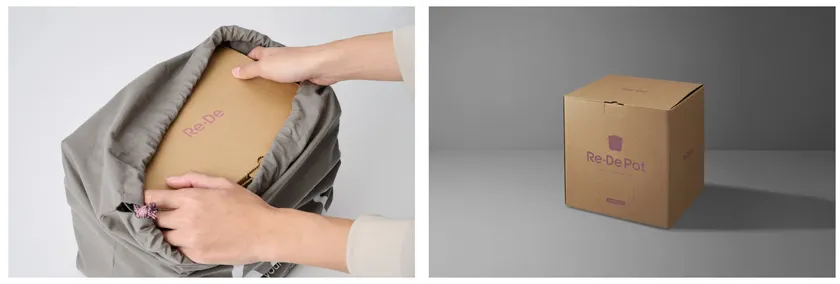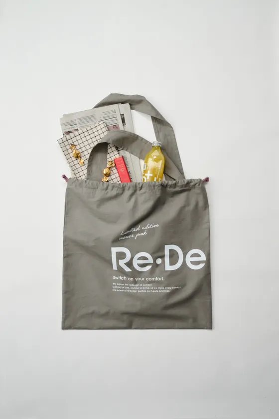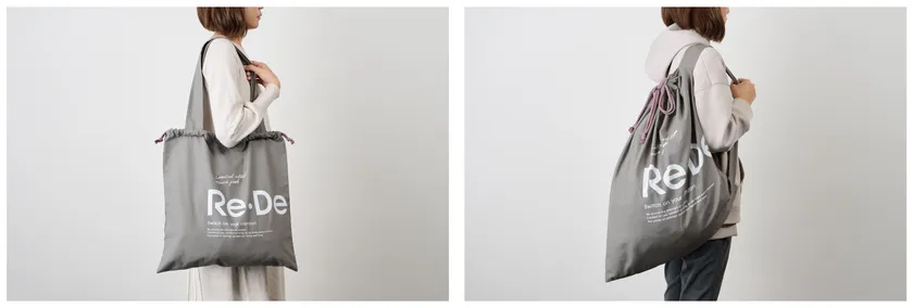 この度発売する「MAUVE PINK」専用のラッピングバッグは、ギフトラッピングとして、製品が届いた時のワクワク感を演出しながら、ランドリーバッグやエコバッグとして、包装の役割を終えた後も使い続けていただけるアイテムとして制作しました。布地のカラーや絞りの紐は、「MAUVE PINK」のカラーに合わせたデザインとなっており、製品ごとのサイズに合わせ、それぞれ違ったスタイルでバッグ使用が楽しめる肩掛け紐が付いています。今までのギフト包装をリデザインした、もらって嬉しく、地球にも優しい、Re・Deならではのアイテムです。