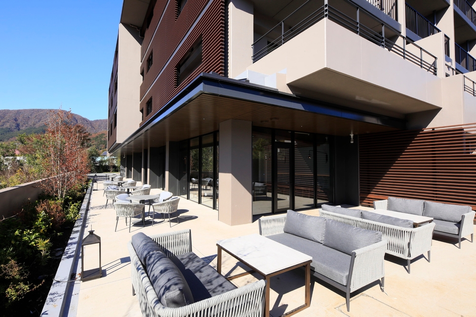 本館および温浴棟の間には、四季折々の箱根・仙石原の移ろいを感じられるテラスを設置。