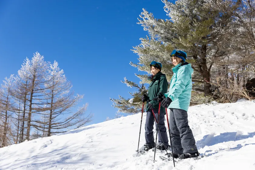 高峰高原には、初心者の方から上級者の方までお楽しみいただける、冬の森や山を歩くコースがございます。一面に広がる白銀の風景やカラマツの霧氷、雪化粧をした冬山の景色、動物の足跡の発見など楽しい体験がいっぱいです。