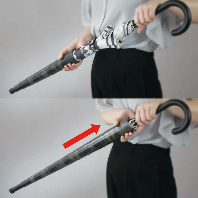 傘を使用した後、先端についているカバーをパパっと上げるだけで、簡単に傘にカバーをかけることができるので、服やカバン、床や座席を濡らさず、電車やバス、車でも快適に過ごすことができます。