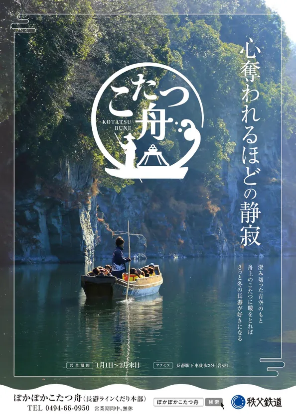 秩父鉄道株式会社(本社:埼玉県熊谷市、代表取締役社長:牧野 英伸)では、「ぽかぽかこたつ舟」を2024年1月1日(月・祝)から2月29日(木)の冬季限定で運航します。和船に設置のこたつで足元を温めながら、約20分間岩畳周辺を周遊しゆっくりと長瀞の渓谷美を眺めることができます。冬の長瀞渓谷は、流れが穏やかで川面はエメラルドグリーンに光り輝くほか、船頭が水をかき分ける音や小鳥のさえずりなどが際立つほどの静寂も特徴です。また、グループ会社の宝登興業株式会社(本社:埼玉県秩父郡長瀞町、代表取締役社長:桜沢 勇二)が営業する宝登山ロープウェイでは元日限定「初日の出鑑賞便」として早朝特別運転を実施するほか、株式会社秩鉄商事(本社:埼玉県熊谷市、代表取締役社長:八木 昭)が営業する「ちちてつ長瀞駅そば店」ではお正月シーズン限定メニューの「長瀞きんぴらそば」を販売します。