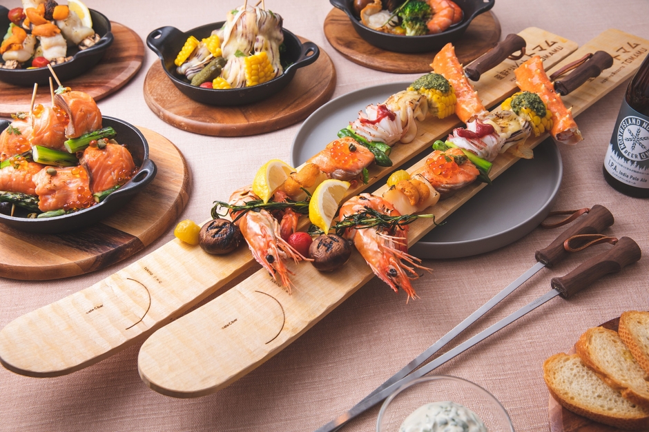 キンキンに冷えたビールと一緒に味わうのは、サーモンやウニなど海鮮をふんだんに使用した海鮮串と海鮮アヒージョです。スペシャルメニューとして、カニ、エビ、ウニなど 11種類の食材を一度に楽しめる海鮮スキー串を用意。ストック型の串に刺さった海鮮串をスキー板型のお皿にのせて提供します。スキーヤー、スノーボーダーは海鮮串を手軽に食べ、滑らない人は海鮮アヒージョを食べて体の芯からゆっくりと温まるのがおすすめです。
