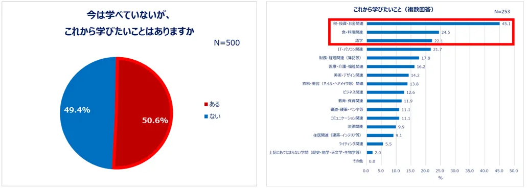 女性たちの学びへの意欲を調査。「今は学べていないが、これから学びたいことがある人」は50.6%で、半数以上が学びに前向きであることが分かりました。具体的に学びたいことは「税・投資・お金関連(45.1%)」「食・料理関連(24.5%)」「語学(22.1%)」が上位に。お金や食など、生活に密接した学びに興味がある人が、比較的多いことが分かりました。