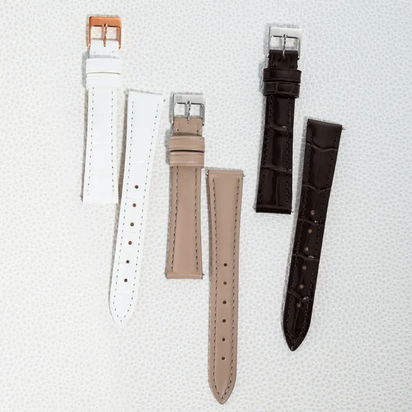 レディース対象時計ご購入で、替えカーフレザーストラップの3色の中からお好きな色のストラップを1本プレゼント。肌なじみがよく、様々なスタイルに合わせやすい「ブラック」「グレージュ」「ホワイト」の3色をご用意しました。