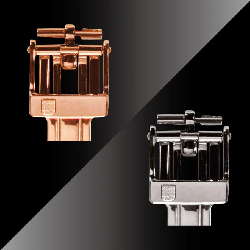 フォールディングバックルは着け外しがよりスムーズなバックルです。ケースカラーに合わせたフォールディングバックルをご用意しています。
