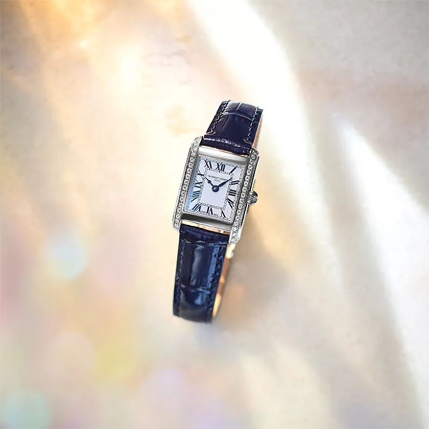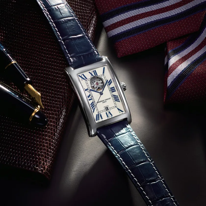 フレデリック・コンスタントの象徴、時計の心臓部の鼓動”ハートビート”が楽しめるコレクション。レクタンギュラーケース”カレ”シリーズの日付表示モデルです。デイト表示の日付板にもスケルトン加工を施しているため、時を刻むメカニズムを見て楽しむことができます。大ぶりのローマンインデックス、ケースデザインに合わせたレイルウエイデザインも印象的。インデックス、3針、ストラップともダークネイビーでまとめた日本限定カラーリング。クラシックな要素に、統一されたネイビーカラーがどのシーンでも自信を持って身につけていただける上品な一本です。