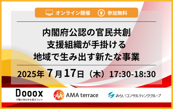 みらいコンサルティンググループ(本社:東京都中央区、代表:久保 光雄 岡⽥ 烈司)は、2025年7月17日にセミナー『内閣府公認の官民共創支援組織が手掛ける地域で生み出す新たな事業』をWEBにて開催します。