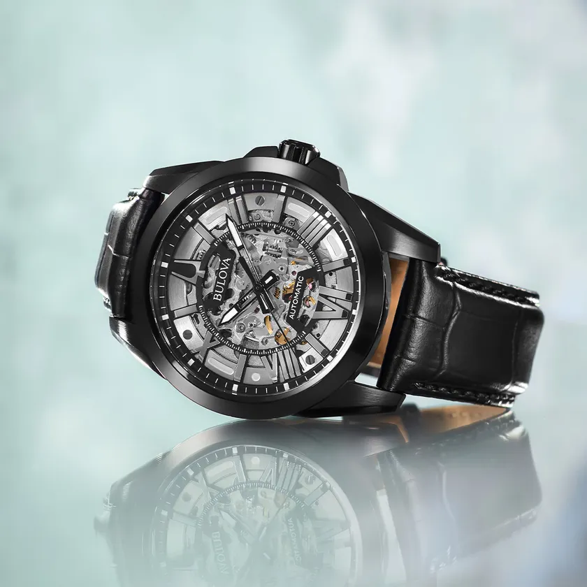 ブローバのコレクションのなかでも個性ある大人な雰囲気が際立つ「クラシック」のスケルトンモデル。文字盤は自動巻きムーブメントの構造を楽しむことができるスケルトンデザインに、大ぶりなローマン数字インデックスとバーインデックスをミックスして大胆にセッティングしました。クラシカルながらもラグジュアリーで力強いデザインが目を引く、ブラックモデルです。