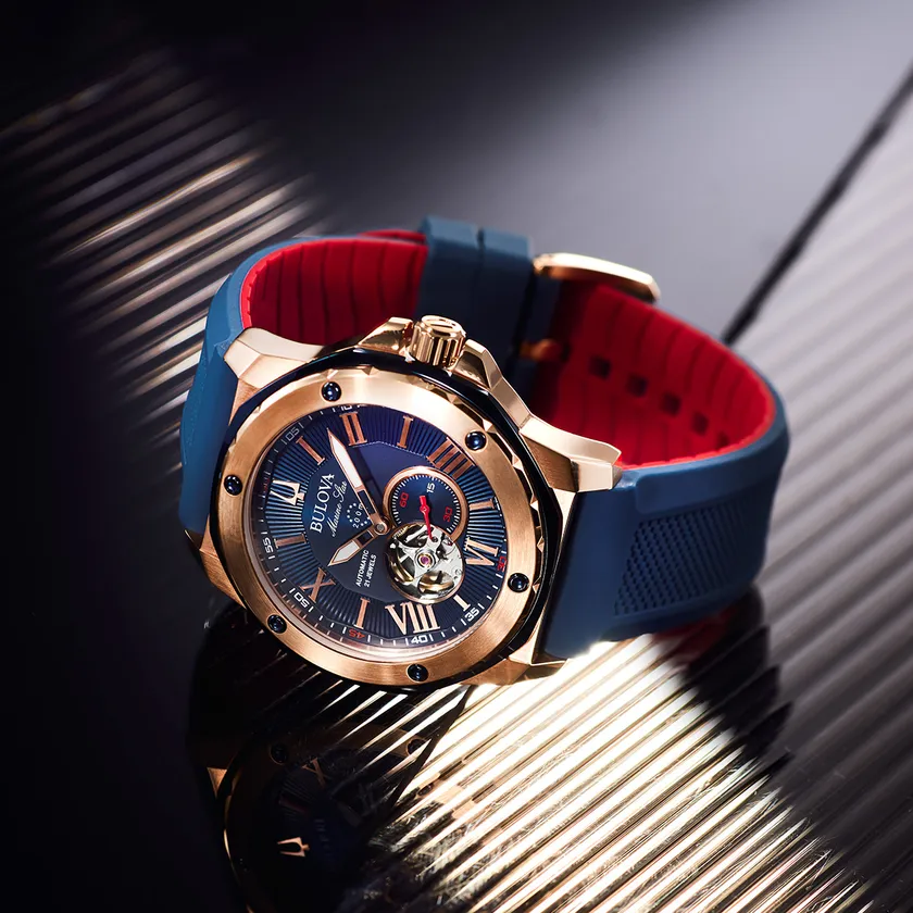 高気圧防水を備える実用時計でありながら、気品にあふれたスポーティーな表情とラグジュアリーなデザインが特徴です。文字盤の7時位置にはオープンハートを配し、機械式ならではのてんぷの動きを見て楽しむことができます。またラバーストラップは表面と裏面で異なる配色にするなど、大人の遊び心を刺激します。