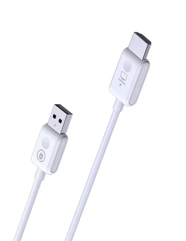 受信機(R1)は、片方をTVモニターのHDMI入力端子に繋ぎ、もう片方をUSB3.x(Type-A)端子、もしくはUSB-ACアダプターにつないで給電を行います。通信距離は約20メートル。HDMIケーブルを使わずに、室内のどこからでもフルHDの大画面を投影できます。さらに、著作権保護としてHDCP1.4(注2)に対応しています。