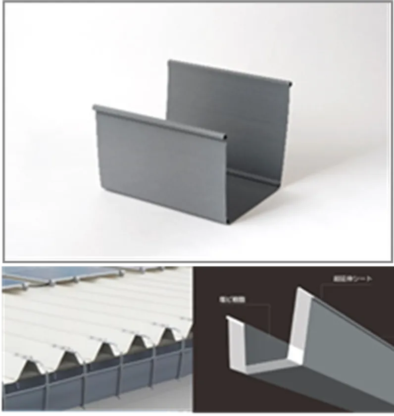 従来、金属製でしか作れなかった大型建物用の雨といを塩ビ製(ポリエステルシートの両面にPVCを積層)に材料変更する事で、重量を50%低減。また、金属加工職人の減少や施工日数の短縮、省力化などの諸課題を解決しました。