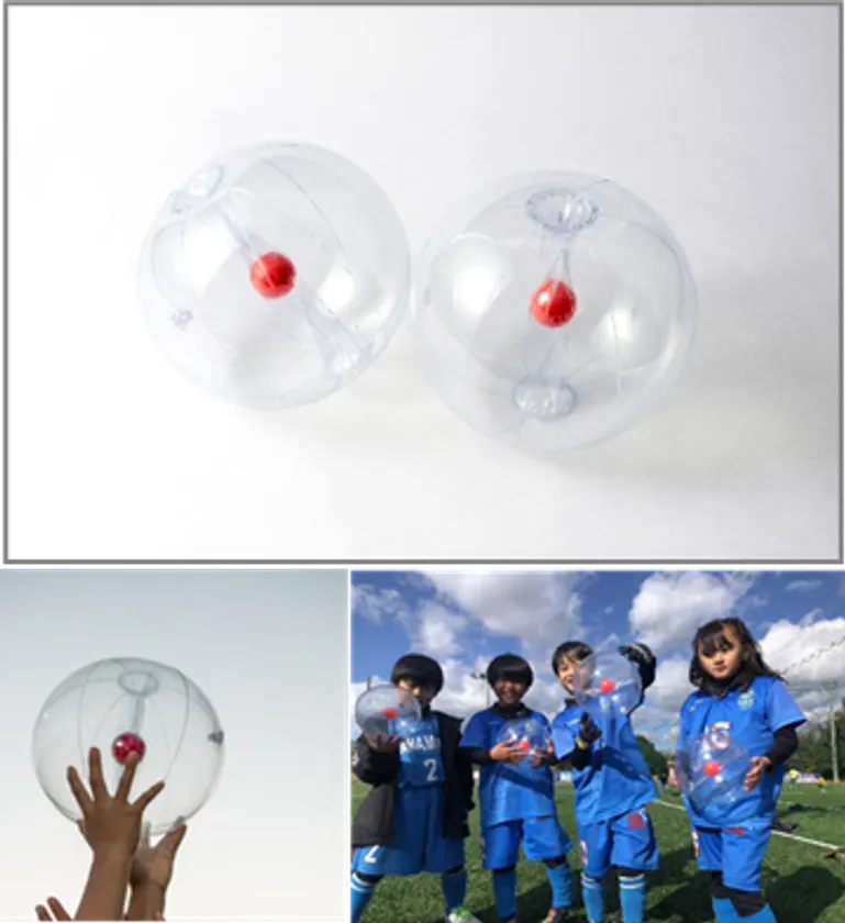 空気ビニールの特性(透明で強い)を活かし、透明なボールの中央(重心)に赤い球を配置。サッカーなどの球技では、ボールの重心を如何に捉えるかを知ることで、練習の効率が上がるとのこと。