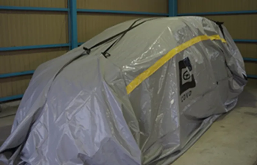 万が一の洪水の時、車をまるごと包み水に浮かせる製品。柔軟性・強度・防水性に優れるPVCターポリン製で、接合部には防水ジッパーを使用しています。また、小さく折りたたんで収納できます。実際にプールで検証したところ、2週間以上、浮き続けたとのこと。