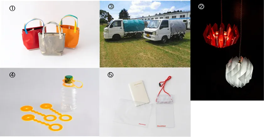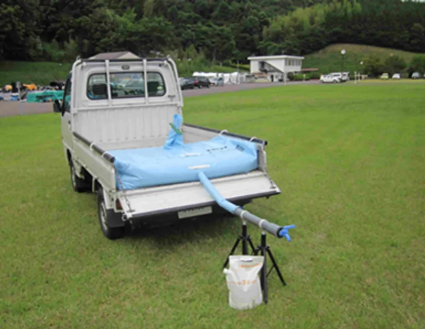 軽トラを利用した給水タンクで、PVCターポリンの強さと耐久性、ウェルダー加工性を活用。また、使用後は製品を折りたたみ、コンパクトに収納できる(耐久年数は10年以上)。タンク素材は食品衛生法に適合。