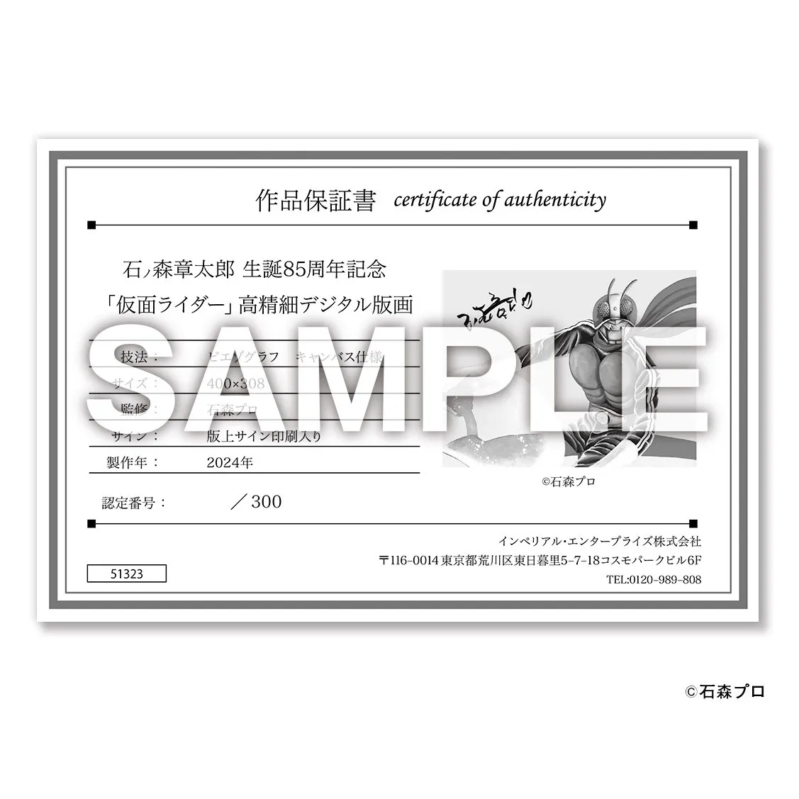 インペリアル・エンタープライズ株式会社(所在地:東京都荒川区、代表取締役社長:原 良郎)は、石ノ森章太郎 生誕85周年記念「仮面ライダー高精細デジタル版画」を、2024年1月15日より、PREMICOオンラインショップで販売開始いたしました。