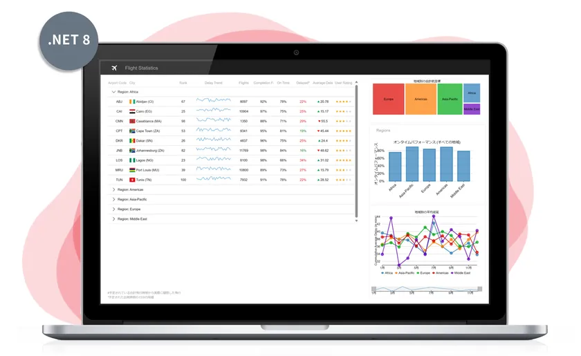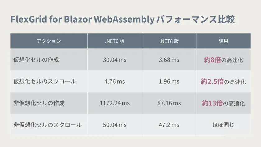 とくにBlazorのデータグリッドコントロール「FlexGrid」では、セルの作成とスクロールのパフォーマンスが大幅に向上しています。Blazor WebAssemblyにおいては.NET 6に比べ平均して約5倍、Blazor Serverにおいては.NET 6の約2倍高速になっており、これまで以上の快適な動作を提供します。
