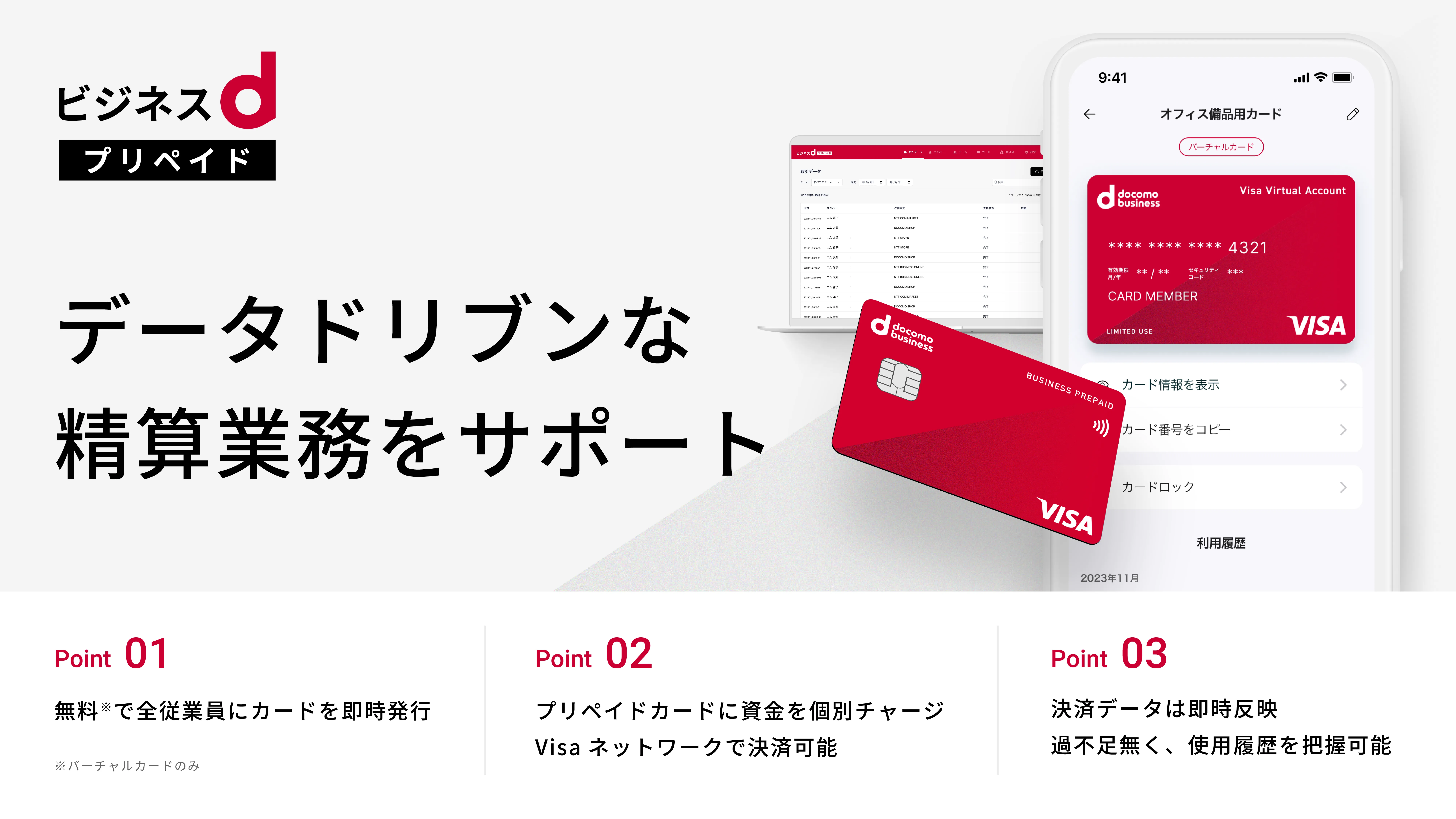 「ビジネスdプリペイド」は、発行手数料無料で従業員に配布することができる、プリペイド方式のビジネスカードです。プリペイド方式なので予算管理がしやすく、キャッシュレスによって立替精算処理が不要となるため、経費処理業務の効率化を実現することができます。