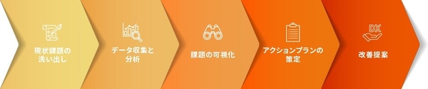 短期間で現状の業務課題を洗い出し、優先順位をつけ、成果を出すことを目指した施策の提案と具体的なアクションプランを共創します。リスクや初期投資を最小限に抑えつつ、段階的にDXを推進し、短期間で成果を出すことで、企業全体のデジタル化を進めていくことにつなげます。