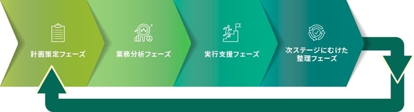 フェーズを4つに分けてコンサルティングいたします。まずはDXの目的を明確にし、実現可能な計画を策定した後、既存の業務プロセスを見直し効率化を図ります。そして、適切な技術の選定と導入プロセスの管理をご支援。さらには、取り組みの成果を評価し次のステージに向けた具体的な計画を策定いたします。貴社に合わせた成長戦略とデジタル戦略をMJSが一緒に描き、ビジネスの変革と成長を実現します。