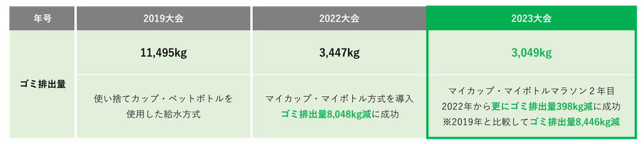 今大会は、昨年と比べ参加者が約4,000人増となったにも関わらずゴミ排出量は398kg減を実現しました。以前の運営方式(2019年大会)では給水において約50万個の使い捨て紙コップ・プラカップ、約31,500本のペットボトルを使用。大会で排出されていたゴミの総量は11,495kgでした。今年はゴミの総量が3,049kgとなり、以前の運営方式と比べると8,446kg減となりました。マイカップ・マイボトル方式をきっかけにゴミゼロの促進をはかった結果、参加ランナーのみならず、運営ボランティア、応援者・来場者すべての皆さんの環境配慮意識が向上していることが見てとれます。