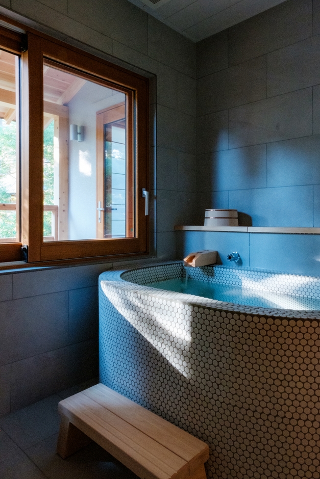 総タイル貼りの純白な浴槽に対し、壁面のカラートーンを押さえることでお湯を際立たせています。そしてこれは浴室からの景色にも通じるところで、真っ白な雪景色との対比も考慮した設計です。