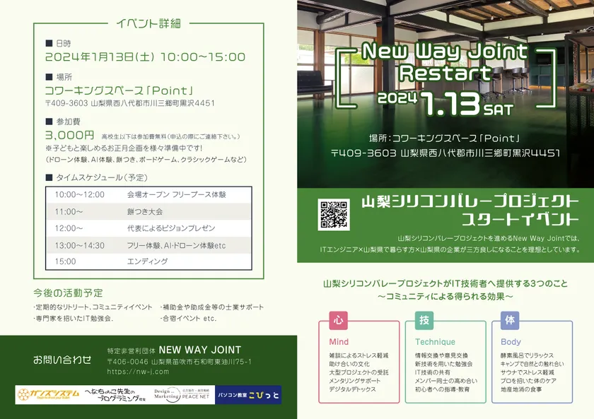 山梨を拠点にIT業界発展の為の活動を行っている、NPO法人 New Way Joint(ニューウェイジョイント)では、2024年1月13日(土)に山梨県の市川三郷町にあるコワーキングスペース「Point」でITエンジニア向けの『心』と『体』を整える癒しイベントを開催いたします。