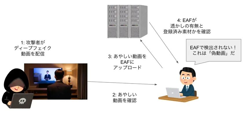 「EAF」はウェブ上でシステムにユーザー登録、ログインし、動画データをアップロードすれば、システムが動画の音声に電子透かしを埋め込み、動画の音声から音響フィンガープリントデータを生成します。透かしが埋め込まれた素材をダウンロードし、各種メディアで配信してくことが可能になります。一方、疑わしい動画がSNS(ソーシャル・ネットワーキング・サービス)などで話題になった場合には、その動画をダウンロードし、システムにアップロードして透かし検出とフィンガープリントによる一致検索を行います。その結果、透かし検出がなく、フィンガープリント一致もしなければ、生成AIによる動画と判定することができます。試用プログラムの先行募集は随時、次のフォームから先着順で受け付けを行います。