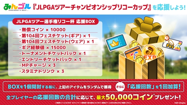 「JLPGAツアーチャンピオンシップリコーカップ」の開催を記念して、期間中『みんゴル』にログインすることで、「JLPGAツアー選手権リコー杯 応援BOX」が入手可能で、かつ応援回数が1回加算されます。「JLPGAツアー選手権リコー杯 応援BOX」は1つ開封する毎にランダムで無償コインをはじめとする『みんゴル』のゲーム内アイテムが入手可能です。