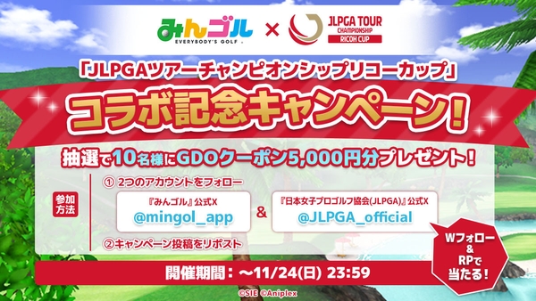 今回の「JLPGAツアーチャンピオンシップリコーカップ」コラボでは、ゴルフファンならびに『みんゴル』ファン相互のファン・エンゲージメントを高めるキャンペーンを開催いたします。
