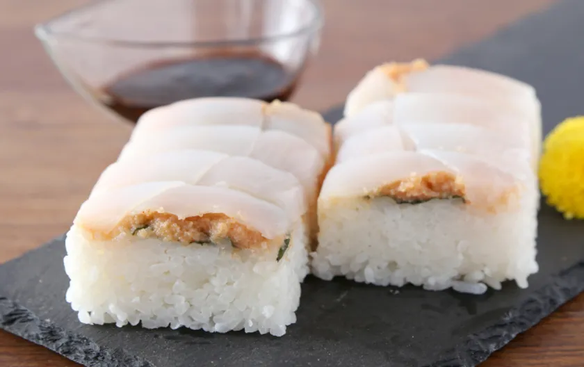 ネタやシャリに圧力がかかりすぎないように設計された専用の容器を使って生産しているため、一般的な押し寿司とは違いふっくらとした口当たりに仕上がっています。