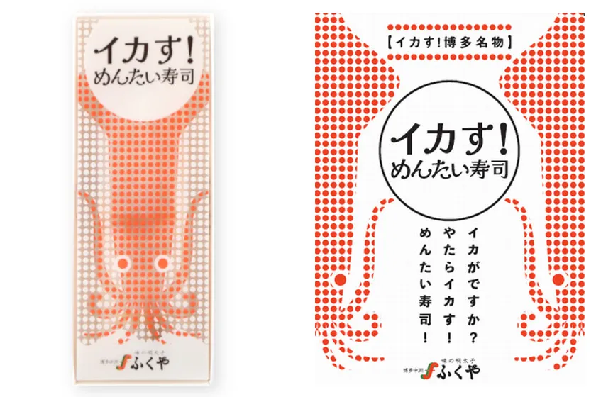 明太子の粒をイメージした赤いドットで表現されたインパクトのあるやりいかを全面に配置したデザインは、イラストレーターのコージー・トマト氏によるもの。