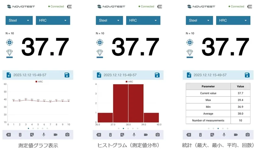 無料のスマホ・タブレット用計測アプリ「NOVOTEST Lab」は、シンプルで使いやすく、高い応答性で快適な検査を保証します。多彩な測定表示モード(グラフ、ヒストグラム、統計、スケール変換)を搭載し、測定結果(PDF・CSV)はメールやクラウドで簡単に共有できます。さらに測定値を記録しながら動画を撮影でき、テキスト・音声メモ・写真の保存も可能、Googleドライブと連携して離れた事務所のスマホ/タブレット/PCで確認できます。