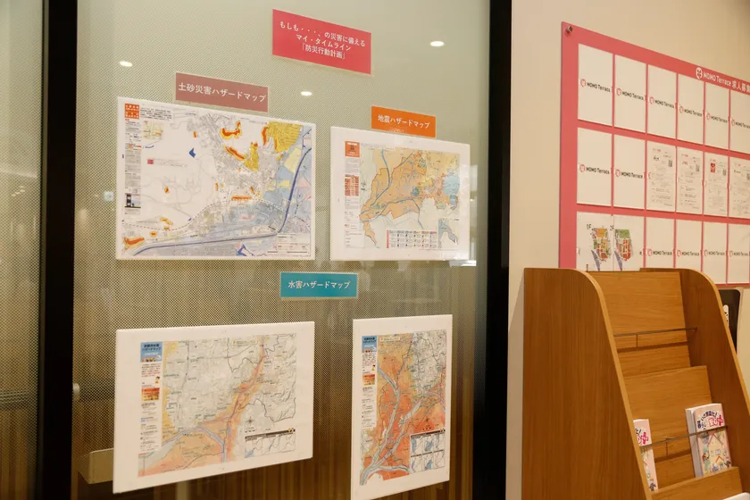 『MOMOテラス』にて、日常のお買物や働く場として利用される皆さまへ向けて、災害への備えを共有するべく『MOMOテラス』が位置する伏見区周辺の「水害ハザードマップ」「土砂災害ハザードマップ」「地震ハザードマップ」の3種類を館内2ヶ所、従業員が利用するバックヤード1ヶ所の合計3ヶ所に掲出。