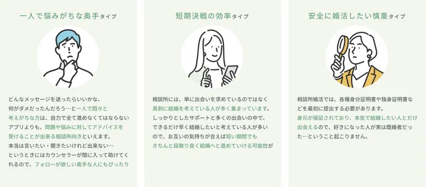 更に、婚活がうまくいかない時はプロが伴走し解決策を探れるなど、婚活中に生じる迷いや孤独を払拭できるメリットも。まさに、タイパ重視で安心して婚活を進めたい人にピッタリです。
